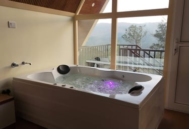 Private Jacuzzi Spa: Melt away stress in your own Jacuzzi, framed by panoramic views of misty valleys and lush greenery.